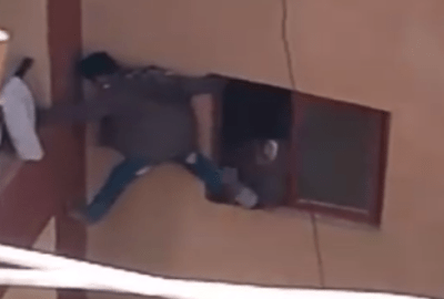 وكان قطاع الأمن العام، رصد بالمتابعة تداول مقطع فيديو يظهر خلاله سيدة تجبر ابنها على التسلق من نافذة سلم عقار إلى شرفة شقة بطابق مرتفع كاد أن يسقط خلالها حتى تمكنت من سحبه لداخل النافذة مرة أخرى والتعدى عليه بالضرب، أمكن لمفتشي القطاع تحديد المنطقة محل الواقعة “مساكن ابني بيتك 2 دائرة قسم ثالث أكتوبر بالجيزة”، والسيدة وإبنها وهما “هند. ر” (35 عاما ـ عاملة نظافة ومقيمة بذات المنطقة)، وابنها “أسامة. ع” (13 سنة ـ طالب).