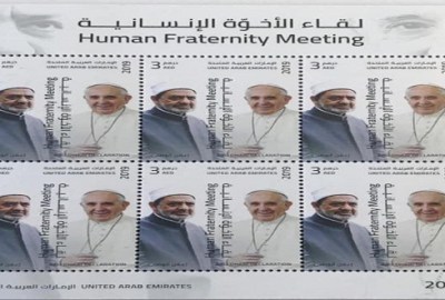 أصدر”بريد الإمارات” طابعًا تذكاريًا فئة ثلاثة دراهم، يحمل صورتي البابا فرنسيس بابا الفاتيكان، وفضيلة الإمام الأكبر الدكتور أحمد الطيب الشريف، احتفاءً بحضورهما التاريخي، للمؤتمر العالمي للأخوة الإنسانية، الذي شهدته أبوظبي على مدى يومين. شيخ الأزهر والبابا فرنسيس