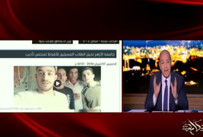 علّق الإعلامي عمرو أديب على الأزمة التي أثيرت عقب تداول مقطع فيديو على شبكة الإنترنت بعنوان “4 طلاب في الأزهر يسخرون من الأقباط”، تضمن إسقاطات مسيئة على الترانيم والصلوات المسيحية. فيديو طلاب الأزهر المسيء