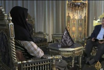 “الغرب يركز في إعلامه على اضطهادكم للأقليات؟”، جواب الجولاني جاء سريعاً: “لسنا بحاجة للغرب ليحدثنا عن حقوق الإنسان وحقوق الحيوان”، وتابع كلامه ليؤكد مرة أخرى ارتباط الجبهة بتنظيم “القاعدة”، وهو ما بدا واضحاً من خلال العلم الموجود في المقابلة.