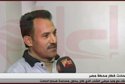 تابع “مُرضي” خلال لقاء مع قناة “extra news”، إنه كان أمام قطار “القاهرة – إسكندرية” 911 وقت وقوع الحادث، منوهًا عن أنه سمع فجأة صوت انفجار عالي جدًا، بعدها شاهد بعض الأشخاص يجرون بجواره والنار مشتعلة بجسدهم.