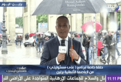 ظهر أحمد موسى، مقدم برنامج “على مسئوليتي”، المذاع على قناة “صدى البلد”، خلال تغطيته لزيارة الرئيس السيسي لألمانيا، وهو يقف في أحد ميادين برلين، ممسكًا بمظلة “شمسية” لتحميه من المطر، مما يؤكد صحة الأخبار التي تم تداولها، حول سفره خارج البلاد، بالرغم من الحكم بحبسه عامين.