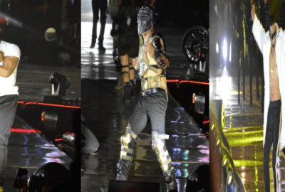 4- ظهر بأكثر من 6 طلات على المسرح حيث ارتدى “سترة” ذهبية أشبه بملابس المحاربين مع حامي للركب وقناعًا على وجهه.