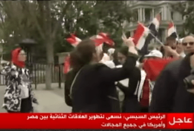 أظهرت اللقطات أفراد الجالية المصرية بالولايات المتحدة في محيط مقر إقامة الرئيس “السيسي” وهم يرفعون الأعلام المصرية ولافتات ترحيبية، كُتب عليها بالعربية والإنجليزية، وسط هتافات “تحيا مصر”.