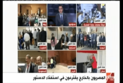 قدمت قناة إكسترا نيوز، بداية من صباح اليوم الجمعة، تغطية خاصة للاقتراع المصريين بالخارج في الاستفتاء على الدستور.لقطات لمشاركة المصريين بالخارج في الاستفتاء على الدستور