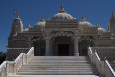وفي بناء المعبد، سيجري استخدام حجر رملي وردي سيؤتى به من الهند، بتصاميم سيعمل عليها مئات الحرفيين، لتشكل في النهاية هيكلا من سبعة أبراج وخمس قبب مزخرفة، تحاكي بتصاميمها أشهر المعابد في العالم.
