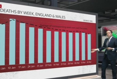 قدم “إد كونواي”، محرر الاقتصاد على شاشة سكاي نيوز، تحليلاً لأرقام الوفيات بسبب الإصابة بمرض كوفيد-19 في المملكة المتحدة محاولاً التنبؤ بالوضع المستقبلي خلال الأسابيع القليلة المقبلة – إلا أن تحليله لا يبعث على الارتياح، على الرغم من أنه أكد أنه ليس طبيبًا وأن الطرح الذي يقدمه صواب يحتمل الخطأ وقائم على البيانات.
