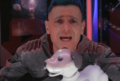 1- اسم الكلب هو “aibo” وهو روبوت مصنع من شركة sony، ويسميه رامز جلال “بامبينو”.