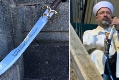 2- صعود مدير الشؤون الدينية لمنبر المسجد (المفترض أنه رجل دين) وهو يمسك بيده سيف، وعندما سئل عن السبب، قال “هذا تقليد من أيام الفتح، الغزو العثماني”، في إشارة واضحة لعودة الخلافة شكلا وموضوعا في عقل النظام التركي.