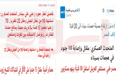 رغم مرور أكثر من 7 ساعات على الحادث الإرهابي الذي وقع صباح اليوم، واستهدف خمسة أكمنة للجيش في الشيخ زويد، مازال هناك تضارب في الأرقام حول أعداد شهداء الجيش في المواقع الإخبارية، يرصد إعلام.أورج الأرقام التي تصدرت هذه المواقع: