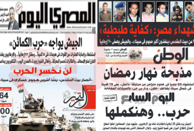 واجتمعت معظم الصحف على وجود حالة “حرب” في سيناء، لكن بسبب ذهاب بعض الجرائد للطبع قبل صدور بيان القوات المسلحة، ساهم ذلك في نشر أعداد مبالغ فيها من الشهداء.
