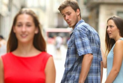 تم تحميل الصورة على موقع Shutterstock مع وصف مختصر وهو: “رجل غير مخلص يمشي مع صديقته وينظر مندهشًا إلى فتاة أخرى بدت أكثر إغراءًا”. وعادت الصورة الأصلية إلى مواقع التواصل في أمثلة عديدة من بينها إنشغال الكثيرين عن اتباع الرجيم الغذائي ونسيانه بشكل كامل إذا حضرت امامهم قطع البيتزا الشهية، ومؤخرًا: تركيز بعض وسائل الإعلام الأمريكية على أزمة جائحة كورونا وعدد الوفيات في أمريكا والتفاتها عن أعداد الإصابات في الصين عمدًا لأسباب تتعلق بمعارضتها للرئيس ترامب.