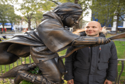 تم الكشف عن تمثال هاري بوتر، الذي لعب دوره “دانيال رادكليف”، في وقت مبكر من صباح اليوم في حفل قدمه نجم التلفزيون البريطاني “أليكس زين”، المعروف بتقديمه العروض الأولى على السجادة الحمراء في الميدان لسنوات عديدة بما في ذلك العرض الأول لفيلم هاري بوتر والأقداس المهلكة – الجزء الثاني.