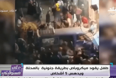 قال الإعلامي أحمد موسى، إن طفلا يقود ميكروباص بطريقة جنونية دهس 5 أشخاص بالمحلة الكبرى في محافظة الغربية.