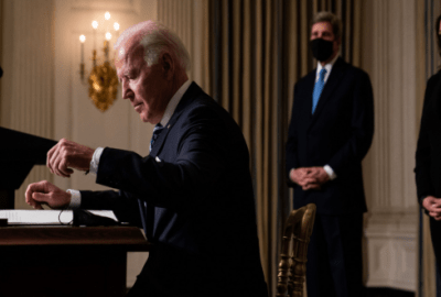 يُظهر الفيديو توقيع بايدن على عدة أوامر تنفيذية في 21 يناير 2021 تتعلق بجهود الولايات المتحدة لمكافحة الوباء.
