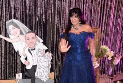 حرصت الفنانة أيتن عامر وزوجها مدير التصوير محمد عز العرب على وضع صورة طريقة لهم بمدخل قاعة الزفاف حيث قاموا بوضع صورة كارتونية له وهو يحملها ويجري بها.