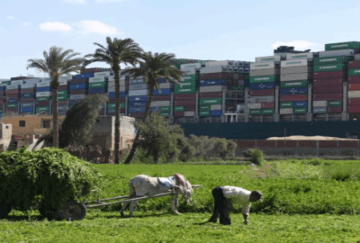 تبدو الناقلة العملاقة شاهقةً بالمقارنة بالمنازل المنخفضة الارتفاع المبنية من الطوب الأحمر، والجاموس الذي يرعى في هدوء والأراضي الزراعية الخضراء المليئة بالنخيل، وعلى مقربة من هذا المشهد الريفي، تقف “إيفر جيفن” وكأنها اختارت أن تكون نصبًا تذكاريًا للعولمة على خلفية ريفية مصرية بامتياز.