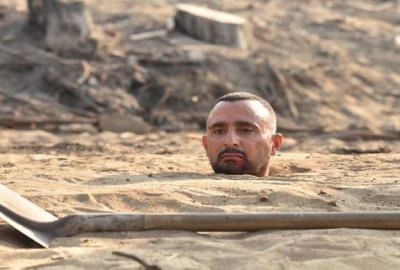 نشر “السقا” الصورة عبر حسابه الشخصي على موقع “إنستجرام” وظهر فيها وهو مدفونا بالكامل في الرمال عدا رأسه.