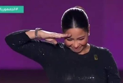 ألقت شيرين فور دخولها على المسرح التحية العسكرية للرئيس عبد الفتاح السيسي، وغنت أغنية وطنية جديدة بعنوان “مصر دايما”.