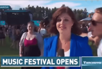 قام شاب باقتحام النقل المباشر لمراسلة قناة cbc news، ليضع قبلة على خدها، خلال تغطيتها لإحدى المهرجانات الموسيقية.