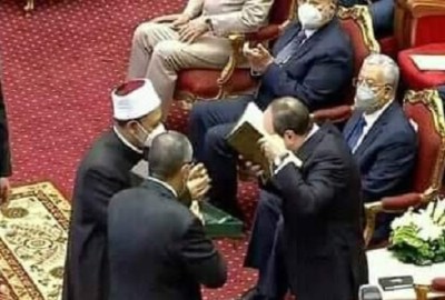 أهدى فضيلة الإمام الأكبر الدكتور أحمد الطيب، شيخ الأزهر الشريف، الرئيس عبد الفتاح السيسي، رئيس الجمهورية، نسخة فريدة من مصحف الأزهر الشريف، وذلك خلال احتفالية المولد النبوي الشريف بمركز المنارة للمؤتمرات الدولية بالتجمع الخامس.