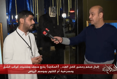 تابع أن جميع الشاشات المتواجدة في المكان تجسد رحلتها بين الماضي وما بين الممثلين المتواجدين لتجسيد رحلة الست في مسرحية أم كلثوم التي تعرض حاليًا بالمملكة.