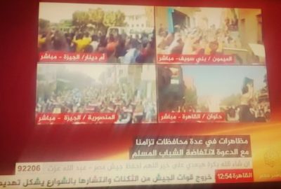 رغم خلو غالبية الميادين المصرية من التظاهرات إلا قليلاً، لكن قناة “الجزيرة مباشر مصر” كان لها رأي آخر من خلال شاشتها التي رصدت تظاهرات في 4 مناطق رئيسية هي المطرية بالقاهرة، المنصورية بالجيزة، الميمون في بني سويف، وأم دينار بالجيزة.