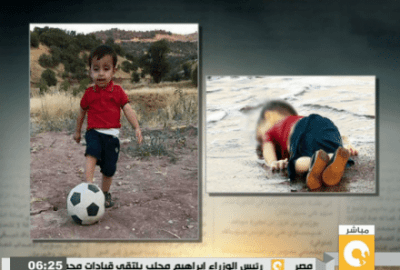 عرض الإعلامي جابر القرموطي إحدى الصور التي تم تداولها للطفل السوري “إيلان كردي“، الذي غرق قرب السواحل التركية أثناء محاولة هرب أسرته من تركيا لليونان، وتظهر الصورة التخيلية وجود الطفل وسط جامعة الدول العربية، وعلق عليها قائلاً: “الصورة دي بتلخص كل الكلام، كأنه عايز يقول للقادة العرب انتوا بتتكلموا في ايه”.