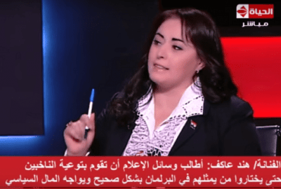 قاطعت الإعلامية لبنى عسل، الفنانة هند عاكف، المرشحة المحتملة للبرلمان المقبل، أمس الخميس، بسبب محاولة الأخيرة ذكر رقم حسابها البنكي على الهواء للتبرع لها أثناء خوضها سباق الانتخابات البرلمانية المقبلة.