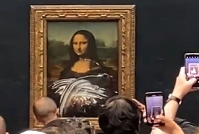 تعرضت لوحة الموناليزا للهجوم من قِبل زائر لمتحف اللوفر في باريس حاول تحطيم الزجاج الذي يحمي اللوحة قبل تلطيخها بكعكة على سطحها في حيلة دعائية واضحة متعلقة بالبيئة.
