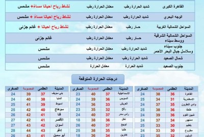 أوضحت الهيئة أنه من المتوقع أن يسود طقس شديد الحرارة رطب على القاهرة الكبرى والوجه البحري وجنوب سيناء وجنوب البلاد، وحار رطب على السواحل الشمالية، معتدل الحرارة رطب ليلا على كافة الأنحاء.