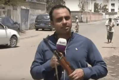 ظهر أحمد بجاتو، مراسل قناة “العربية”، وهو يحمل السلاح، خلال إعداده لتقريرًا عن “فوضى السلاح” في مدينة عدن اليمنية، حث انتشرت ظاهرة حمل السلاح بين المدنيين، إما للحماية أو الوجاهة -حسب ما جاء بالتقرير-.