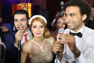 وشارك أعضاء فرقة “مسرح مصر” في الغناء للممثل الشاب مع فريق المهرجانات “المدفعجية” الذي أهدى العريس أغنية خاصة بعنوان “فرحة علي ربيع”.