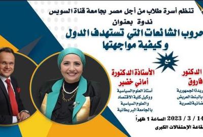 تقام في الواحدة ظهر غد الثلاثاء في قاعة الاحتفالات الكبرى بجامعة قناة السويس بالإسماعيلية، ندوة بعنوان “حروب الشائعات التي تواجه الدول و كيفية مواجهتها” يتحدث فيها الإعلامي الدكتور حسام فاروق الباحث المتخصص في الإعلام السياسي الدولي و أحد أبرز الخبراء المصريين في تحليل مضمون الخطاب السياسي في الإعلام الأجنبي ، و هو يعمل ايضا مدير تحرير في جريدة الجمهورية و معد و مقدم برنامج “بالبنط العريض” على القناة الفضائية المصرية، و الأستاذة الدكتورة أماني خضير أستاذ و رئيس قسم العلوم السياسية، و وكيل كلية الاقتصاد و العلوم السياسية بالجامعة البريطانية، و الحاصلة على درجة الزمالة العليا لأكاديمية التعليم العالي البريطانية وفق معايير دعم التعليم والطلاب في مجال التعليم العالي بالمملكة المتحدة، يذكر أن الدكتورة أماني خضير هي إبنة العالم الجليل الراحل الأستاذ الدكتور أحمد اسماعيل خضير ثاني رئيس لجامعة قناة السويس و مؤسس مقر الجامعة الحالي.