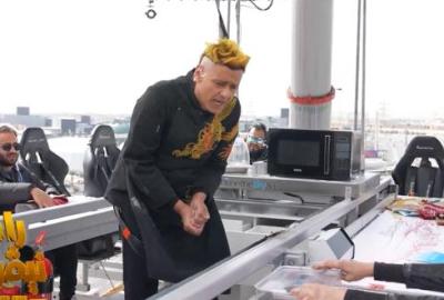 ظهر محمد فراج وبسنت شوقي، خلال المقلب على أنهم تلقوا دعوة لافتتاح مطعم في الرياض، وكان المطعم المقصود يجري مائدة طعام معلقة في الهواء، ويحاول رامز وهو متنكر في زي الشيف التظاهر بأن المطعم يسقط.