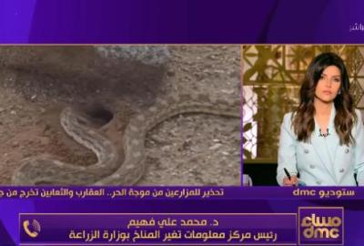 أضاف “فهيم” خلال مداخلة هاتفية ببرنامج “مساء dmc“، مع الإعلامية إيمان الحصري، عبر شاشة “dmc”، أنه مع بدايات زيادة درجات الحرارة وأشعة الشمس العالية تظهر الثعابين والعقارب خاصة في الأماكن التي تكون بها رطوبة عالية.