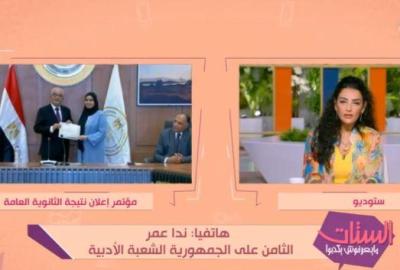 قالت الطالبة ندى عمر، الحاصلة على المركز الثامن على مستوى الجمهورية في الشعبة الأدبية، إنها لم تتوقع النتيجة، كما أنها وجهت نصائح للطلاب القادمين، وصرحت عن ميولها بالتحاق الكلية.