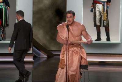 قبل ظهور المصارع العالمي على المسرح لتقديم الجائزة، تحدث مقدم الحفل جيمي كيميل، مستعيدا مشهدا من حفل الأوسكار لعام 1974، حينما خرج رجلا عاريا بشكل مفاجئ يجري وراء الممثل ديفيد نيفن، على المسرح، ليعلق ساخرا: "هل تتخيلوا أن يعبر المسرح رجلا عاريا الليلة؟".