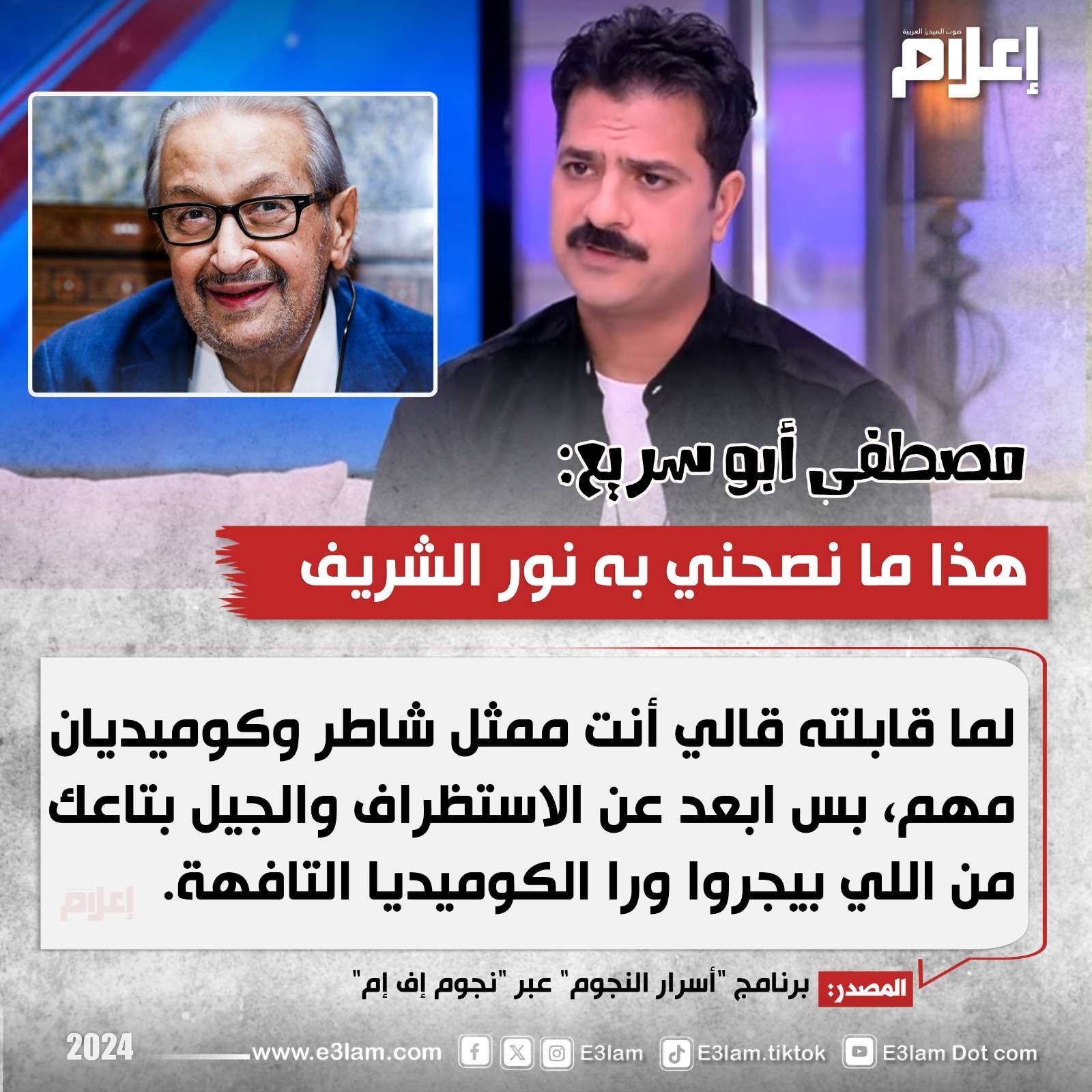 قال "أبو سريع" خلال حواره مع الإعلامية إنجي علي في حلقة مساء الخميس من برنامج "أسرار النجوم" المذاع عبر شاشة "نجوم إف إم"، إن عند مقابلته مع نور الشريف لأول مرة بعد ترشيحه للمشاركة في مسلسل "عرفة البحر"، قدم له نصيحة قائلا: "أنت ممثل شاطر وكوميديان مهم، بس ابعد عن الاستظراف والجيل بتاعك من اللي بيجروا ورا الكوميديا التافهة".