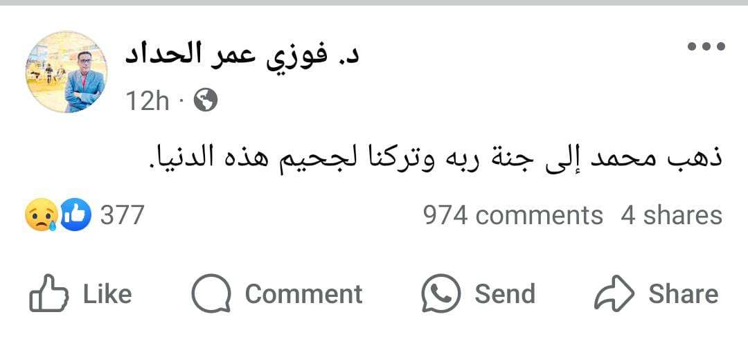 أعلن "الحداد"، خبر وفاة نجله من خلال منشور له عبر حسابه الرسمي على موقع التواصل الاجتماعي "فيس بوك"، وكتب: "ذهب محمد إلى جنة ربه، وتركنا لجحيم هذه الدنيا".