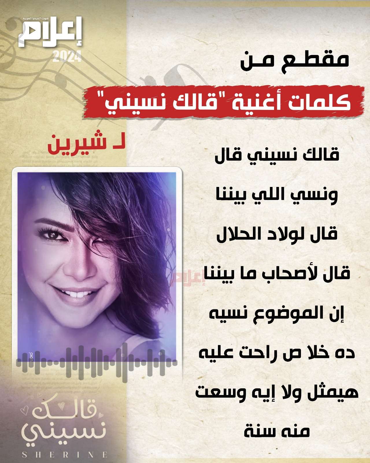 طرحت الفنانة شيرين عبد الوهاب أغنية جديدة بعنوان "قالك نسيني"، وطرحتها عبر حسابها بموقع التدوينات القصيرة "إكس"، وقناتها بـ"تليجرام".