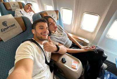نشر صانع المحتوى ياسر أحمد صورة من الطائرة تجمعه بزوجته البلوجر آية إبراهيم. وظهر خلفهما في الصورة الفنان أحمد شيبة.
