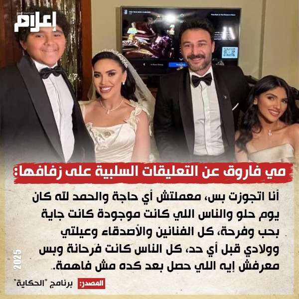 قالت "فاروق" خلال مداخلة هاتفية مع الإعلامي عمرو أديب في برنامج "الحكاية"، المذاع عبر شاشة "mbc مصر": "أنا اتجوزت بس، معملتش أي حاجة والحمد لله كان يوم حلو والناس اللي كانت موجودة كانت جاية بحب وفرحة، كل الفنانين والأصدقاء وعيلتي وولادي قبل أي حد، كل الناس كانت فرحانة وبس معرفش إيه اللي حصل بعد كده مش فاهمة".