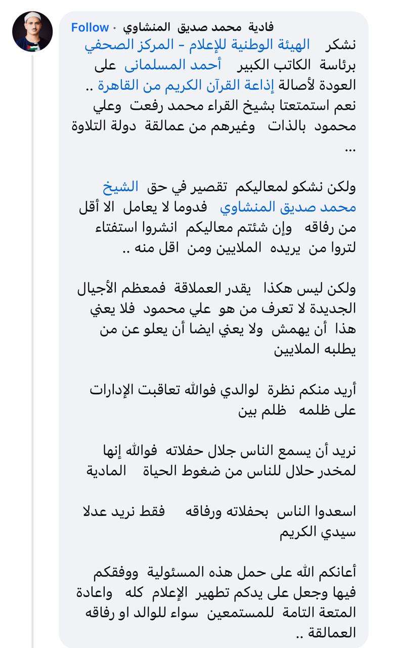 تابعت: "ولكن نشكو لمعاليكم تقصير في حق الشيخ محمد صديق المنشاوي فدوما لا يعامل إلا أقل من رفاقه وإن شئتم معاليكم انشروا استفتاء لتروا من يريده الملايين ومن أقل منه".