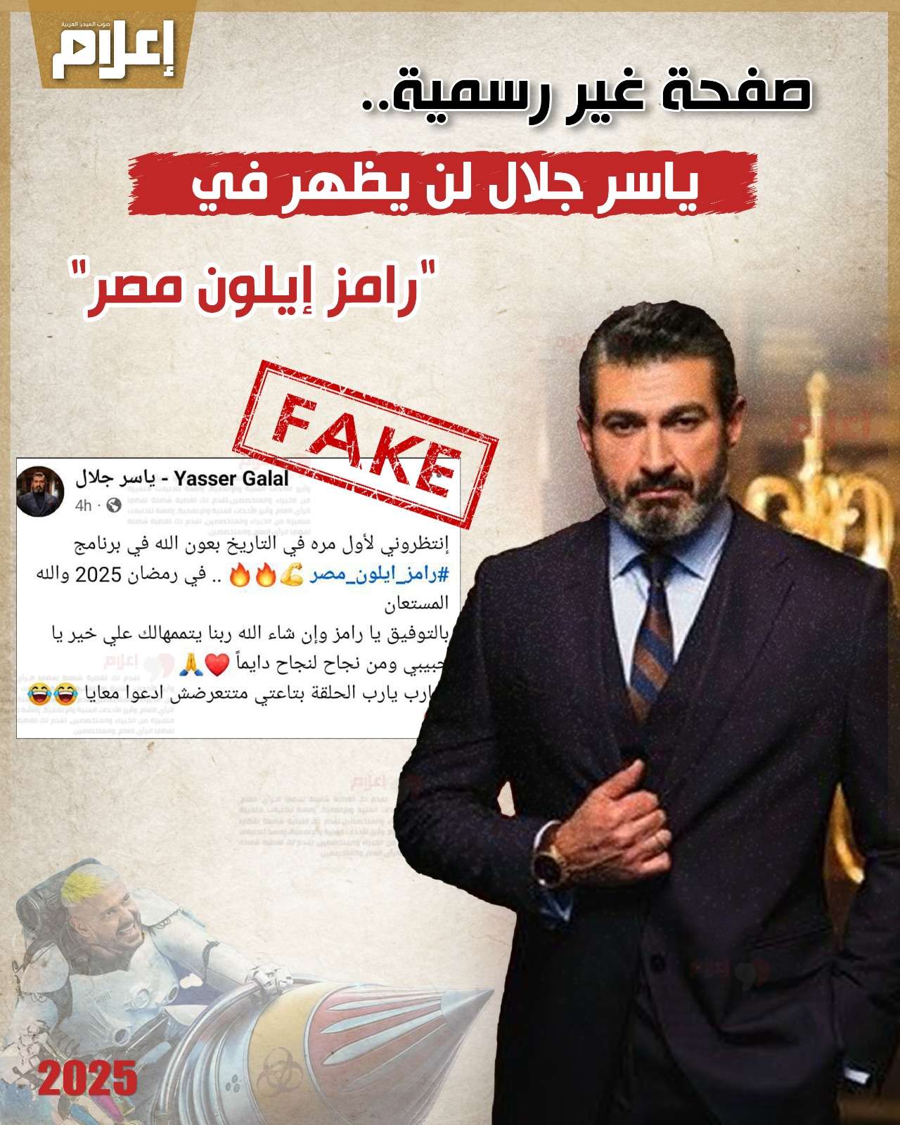 وذلك بعد تداول منشور لإحدى الصفحات التي تحمل اسمه عبر "فيس بوك"، تقول فيه: "انتظروني لأول مرة في التاريخ بعون الله في برنامج (رامز إيلون مصر) في رمضان 2025 والله المستعان.. بالتوفيق يا رامز وإن شاء الله ربنا يتممهالك على خير يا حبيبي ومن نجاح لنجاح دايما.. ويا رب الحلقة بتاعتي ما تتعرضش.. ادعوا معايا".