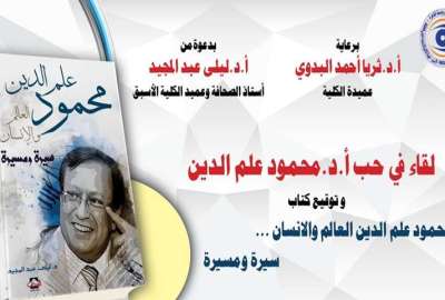 تنظم كلية الإعلام بجامعة القاهرة، برعاية الأستاذة الدكتورة ثريا البدوي، عميدة الكلية، لقاءً لتوقيع ومناقشة كتاب "محمود علم الدين.. العالم والإنسان.. سيرة ومسيرة"، تأليف الدكتورة ليلى عبد المجيد، عميدة الكلية الأسبق.
