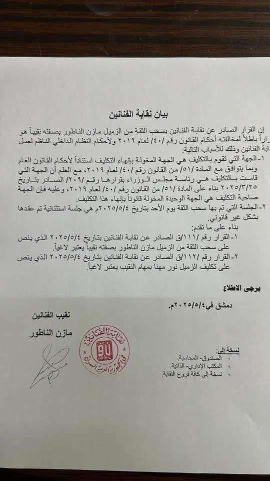 ١- القرار رقم / ۱۱۱ / ق الصادر عن نقابة الفنانين بتاريخ ٢٠٢٥/٥/٤ الذي ينص على سحب الثقة من الزميل مازن الناطور بصفته نقيباً يعتبر لاغياً.