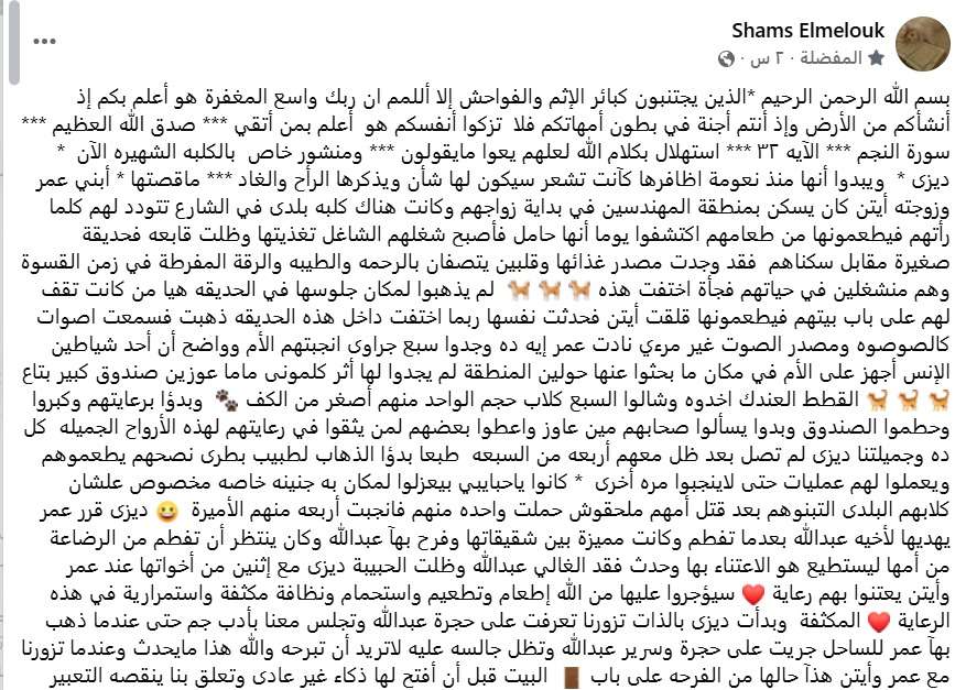 أضافت أن وفاء "ديزي" وذكاءها يثيران دهشتهم، فهي لا تفارق مكان عبد الله كلما عادت إلى بيت العائلة، مؤكدة أن هذه المواقف تمنحهم عزاءً خاصًا، وتُذكرهم بأن الرحمة باقية حتى في قلوب الحيوانات.