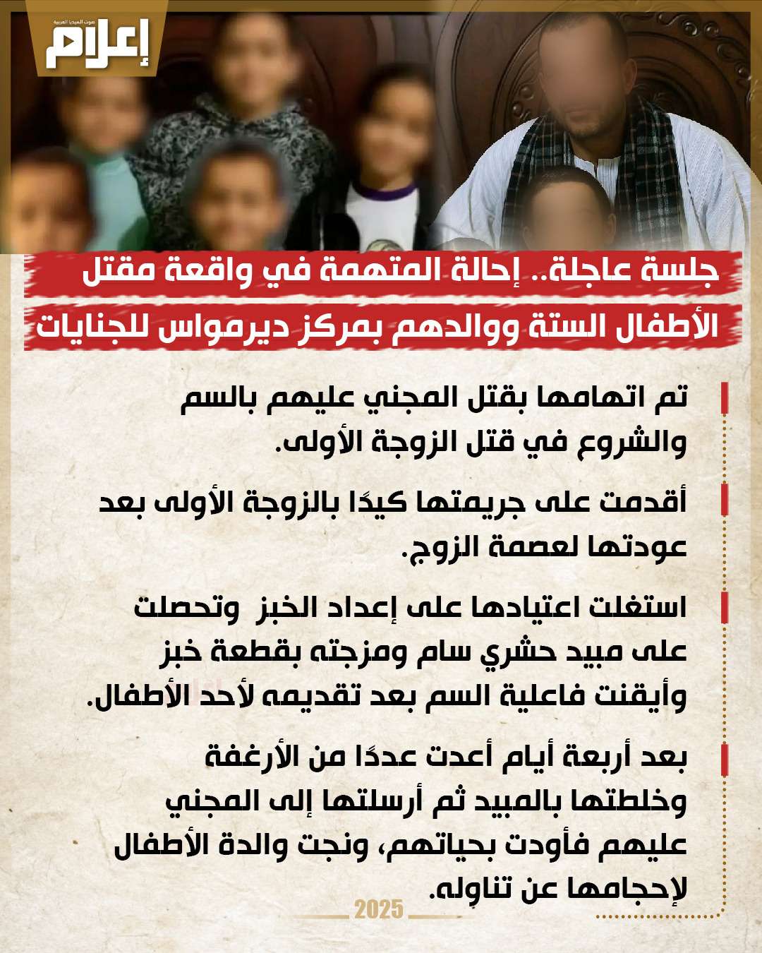 وخلال هذا البيان أعلنت النيابة العامة إحالة المتهمة زوجة الأب الثانية إلى محكمة الجنايات المختصة لارتكابها جريمة قتل المجني عليهم بالسم عمدا مع سبق الإصرار والشروع في قتل الزوجة الأولى.
