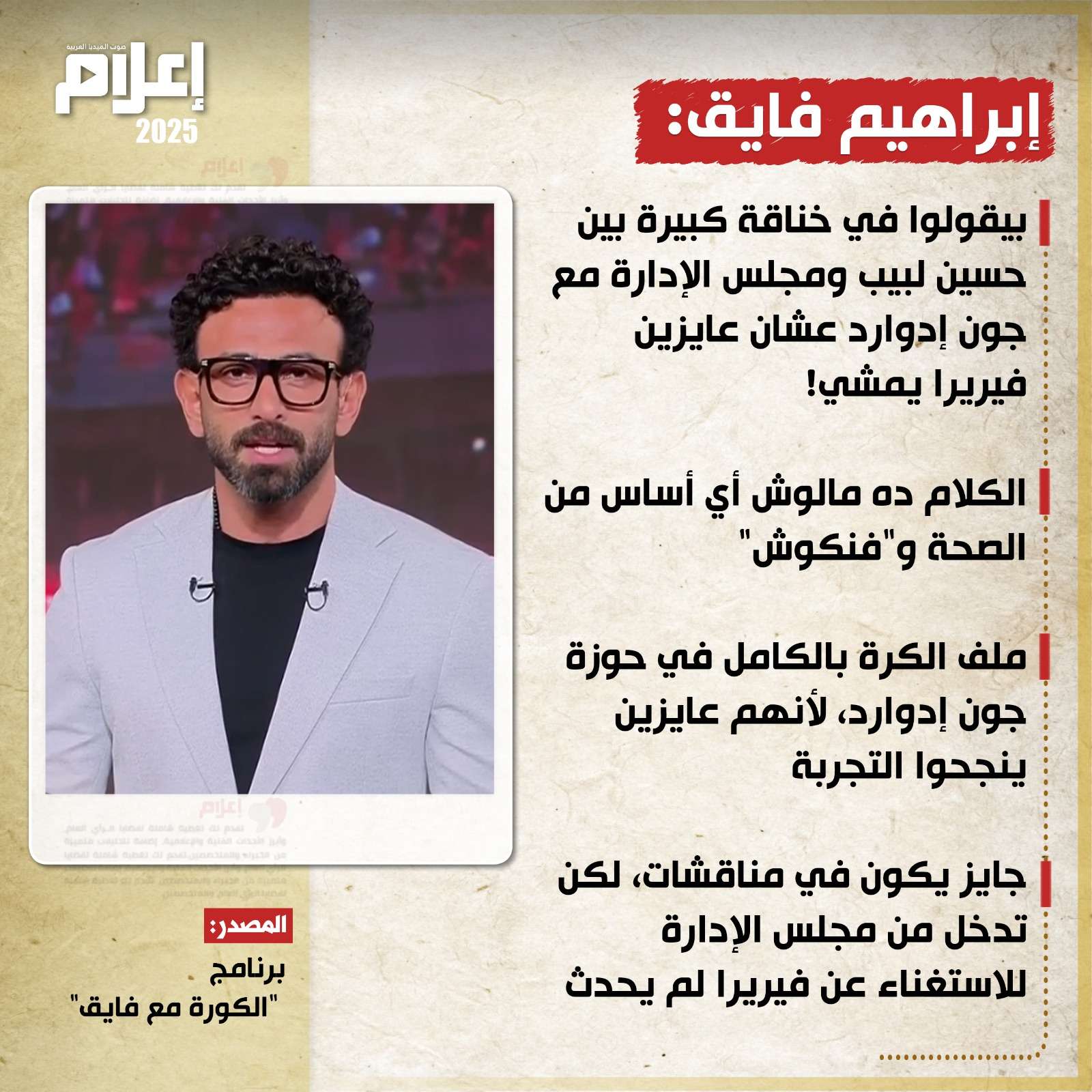 قال "فايق" خلال حلقة مساء الاثنين من برنامج "الكورة مع فايق" المذاع عبر شاشة "mbc مصر 2"، إن هناك أنباء لا أساس لها من الصحة حول رغبة الكابتن حسين لبيب، رئيس نادي الزمالك، في الاستغناء عن "فيريرا"، وهو ما تسبب في صدام مع جون إدوارد بسبب رفض الأخير هذا القرار، موضحًا: "الكلام ده مالوش أي أساس من الصحة وفنكوش ومحصلش خالص".